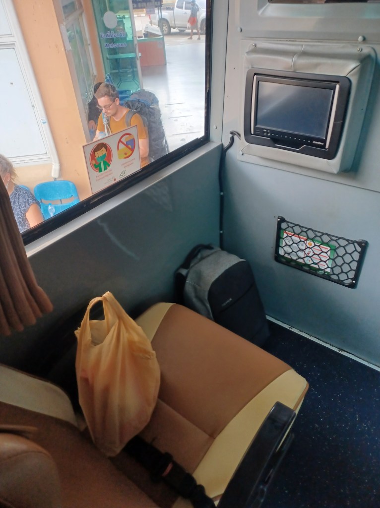 I’m travelling on a Green Bus which is quite fancy really, it has air con and a loo! I’d chosen my seat when I booked and opted for A1 right at the front, as I thought it would give me the best view, sideways and through the front drivers windows, Sadly not! The drivers section is partitioned off so my front view was a wall! But the seat is big and comfy, so I’m happy.