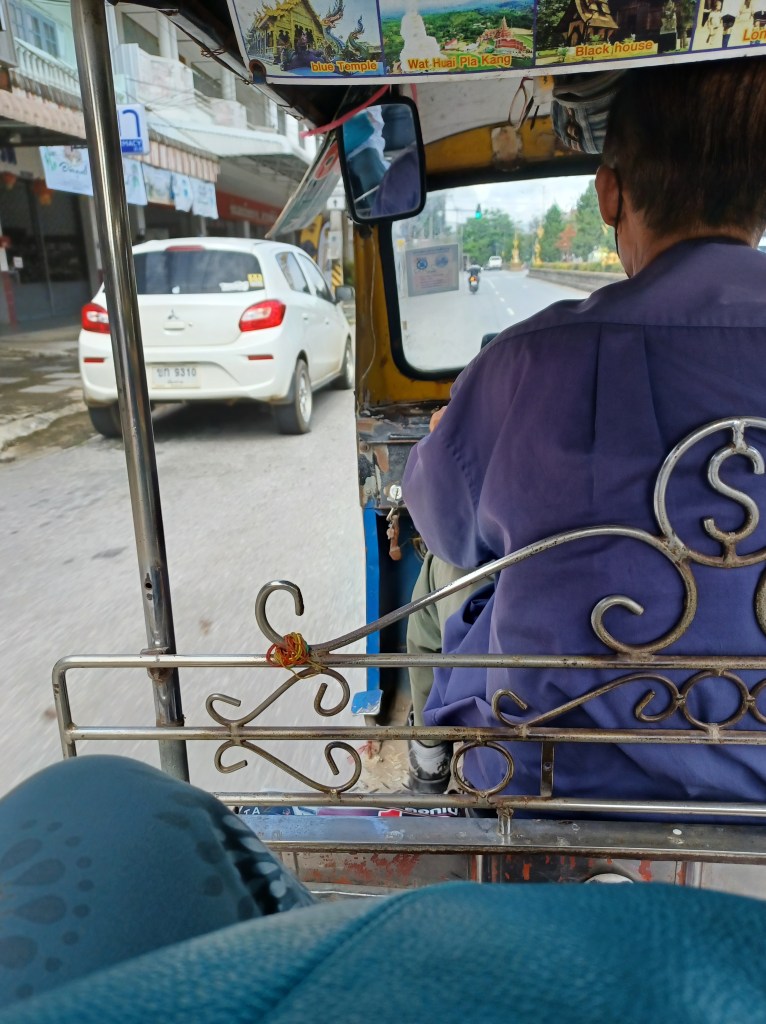 I jump in and off me go! I realise pretty soon that I’ve jumped into possibly the oldest, rickityest Tuk Tuk in Chiang Rai, I just hope he makes it there! He does. He drops me off and settles back to wait.