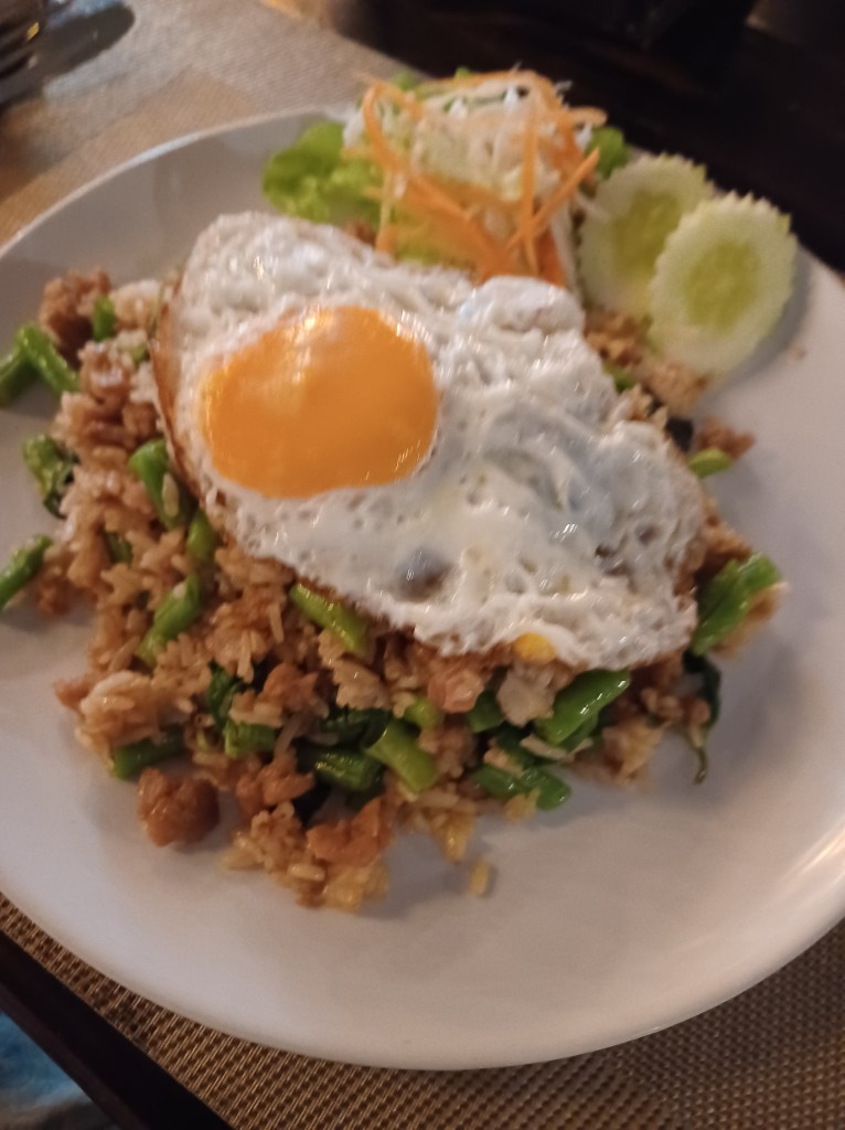 I have another swim, read for a bit and go for an early, light dinner, just some vegetable rice, with a fried egg!