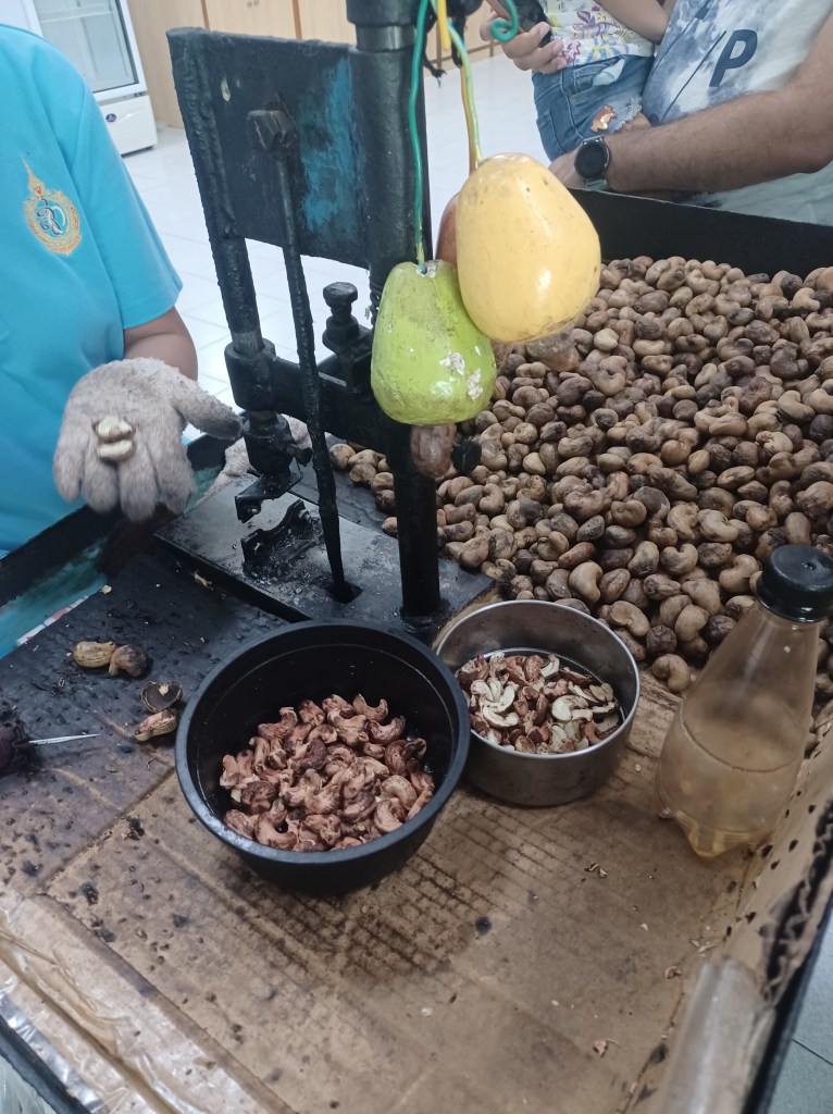 So, apparently all Cashew Nuts are shelled by hand, as the nuts are all different shapes and sizes so machines can’t do it! It looks like a long process, the nut grows on the bottom of a fruit, which is then picked the nut taken out, the outer shell pierced then cracked and the nut removed, at this stage it is inedible until it is roasted. No wonder they are so expensive. There is so much work involved. 😳