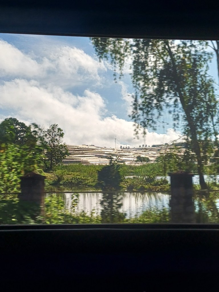 I had this idea that we would leave HCM and then be driving through the countryside. This is not the case we seemed to just drive through built up areas for hours and hours. After nearly 4 hours we stopped at a service area. We arrived at the same time as a huge storm with torrential rain. 🌧️ They have a pretty clever system, whereby you leave the bus, minus your shoes and as you get off there is a box full of plastic sliders for you to use. This prevents people’s shoes getting wet!